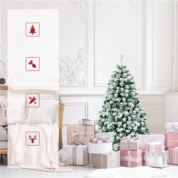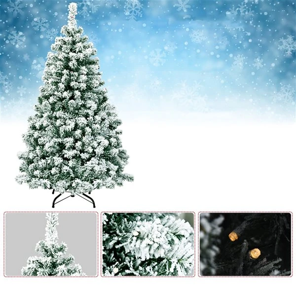 Transform your living room into a unique winter wonderland with this pre-lit snow flocked Christmas tree. The tree, crafted with 400 branch tips and snow flocked leaves, is leafy and elegant. It will give you the illusion of a full-bodied genuine tree. Made of high quality PVC material, these snow flocked leaves with exquisite craftsmanship will not fall off or fade easily, ensuring long-term use. 200 warm LED lights hanging on the branches will bring a festival glow to your home. Supported by sturdy metal stand, this artificial Christmas tree will keep standing upright for years to come. At the same time, the metal stand is foldable to facilitate storage. All hinged construction makes the artificial tree easy to set up and fluff. In addition, this Xmas tree can be divided into 3 sections and placed in a storage bag for future reuse easily. With its eye-catching appearance, this snow flocked Christmas tree will definitely be a glamorous decoration for any place.