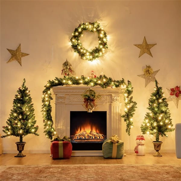 This pre-lit artificial Christmas decoration set is definitely a beautiful addition to your home, creating a warm and ideal centrepiece for the whole family to enjoy. Comes with a wreath, a garland and 2 entrance trees, this charming Christmas set brings home happy holiday feel. Pre-strung LED lights add romantic feel to this decorative set, and polished red berries enhance natural vividness to the tree.