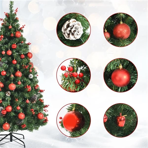Merry Christmas and happy new year! Why not get a gorgeous and eye-catching Christmas tree to decorate your home and welcome the coming festival? This artificial Christmas tree comes with 111 pieces of ornaments, including snowy pine cones, red berries, bright balls, glittery balls, matte balls and red apples. All these accessories endow the tree with super charms. You can hang them up according to your inspirations on the lush tree body. In addition, 150 LED lights will glitter warm white lights in the darkness, making a warm and romantic atmosphere for you. With a robust metal stand, the Christmas tree will stand in firmness all the Christmas season. Moreover, hinged branches and separated sections make convenience for tree setup that save your energy and time.