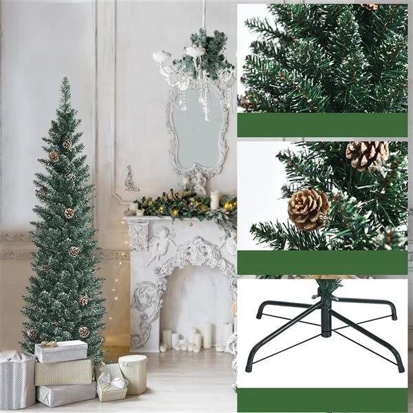 There is no better decoration than a classic Christmas tree to celebrate the coming new year. This slim snowy realistic pine tree with 5-ft in height looks grand to catch people’s eyes at sight. Featured with 214 branch tips, the pencil Christmas tree look flourishing without taking up space. The snowy tips and pine cones enhance vividness and vibrancy to the tree. In addition, the tree needs less time and energy on fluffing and assembling, so you can spend more time on ornaments hanging.