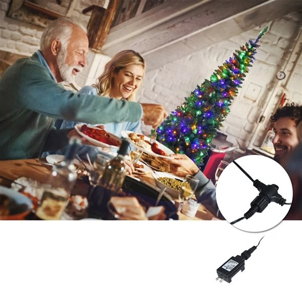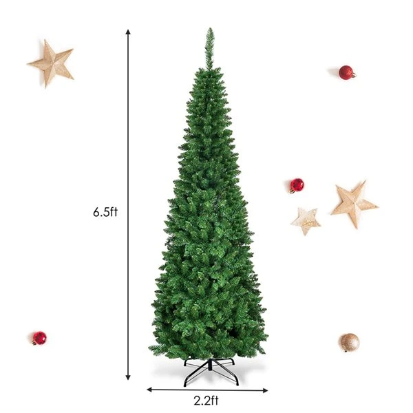 This is the brand new 6.5-ft pre-lit pencil Christmas tree which is designed with 708 branch tips to offer a realistic and lush appearance. Pre-installed with 250 colourful LED lights, the slim tree saves you the hassle of hanging up the lights and help light up your room. It is effortless to make the tree fluff due to its hinged construction, while also facilitating its assembling and storage. Foldable X-shaped iron stand with foot pads prevents breakage and enhances the balance of the tree, offering stability to keep the wondrous tree standing all year around. Whether for your home, courtyard, or for commercial places like shops, hotels, the slim Christmas pencil tree is the perfect eye-catching decoration to add multiple fun and festive holiday fullness!