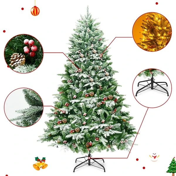 This pre-lit snow flocked Christmas tree will give you a memorable Christmas impression. The tree, crafted with 673 PVC branch tips and snow flocked leaves, is leafy and lifelike. It will give you the illusion of a full-bodied genuine tree. 450 Bright LED lights decorated along the lush, realistic pine branches to create a merry and jolly atmosphere. Supported by sturdy metal stand, this artificial Christmas tree will keep standing upright for years to come. At the same time, the metal stand is foldable to facilitate storage. The Christmas tree features a mixture of light green PE and traditional PVC tips providing it with a fresh-cut look that will last all season. In addition, the tree can be divided into 3 sections and placed in a storage bag for future reuse easily. With its eye-catching appearance, this snow flocked Christmas tree is definitely a glamorous decoration for any place.
