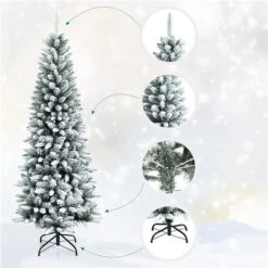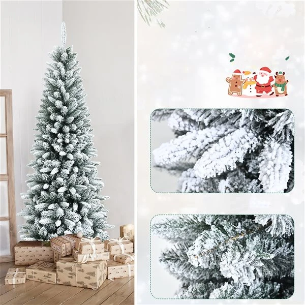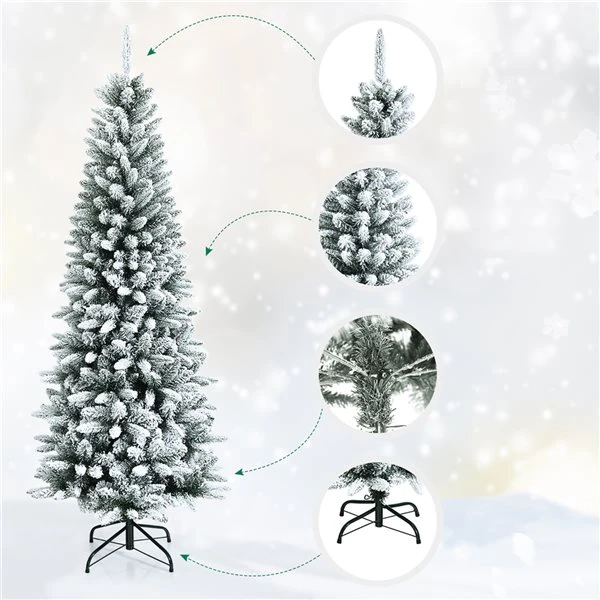 A snow-flocked artificial Christmas tree create strong festive atmosphere and wintry vibe in your home. Standing at 6.5 ft, this snow-flocked tree comes with 829 branch tips, which have 2 leaf shapes to create natural gradations. Plentiful snow-flocked leaves create flourishing and luxuriant appearance. And this Christmas pencil tree adopts premium PVC and PE materials, making it stand out of inferior trees.