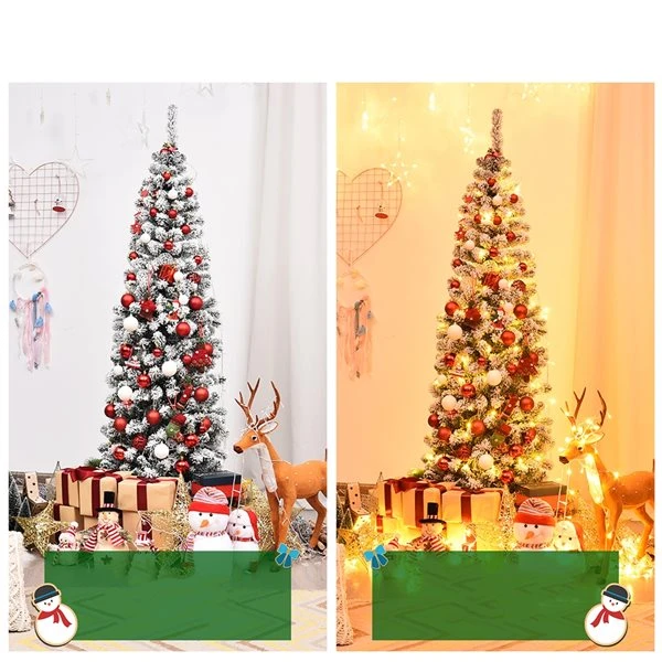 Transform your living room into a unique winter wonderland with this pre-lit snow flocked pencil Christmas tree. The tree, crafted with 500 branch tips and snow flocked leaves, is leafy and elegant. It will give you the illusion of a full-body genuine tree. 250 warm LED lights will bring a festival glow to your room. High quality PVC branch tips with exquisite craftsmanship will not fall off or fade easily, ensuring long-term use. Supported by sturdy metal stand, this artificial Christmas tree will keep standing upright for years to come. At the same time, the metal stand is foldable to facilitate storage. All hinged construction makes the artificial tree easy to set up and fluff. In addition, this Xmas tree can be divided into 3 sections and placed in a storage bag for future reuse easily. With its slim pencil design and realistic appearance, this artificial Christmas tree is perfect for display in corners or small rooms.