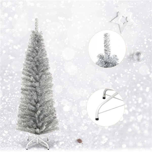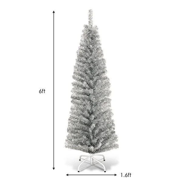 - Slim pencil shape design takes up less space, ideal for any narrow place; distinctive silver tinsel tree provides a unique flavour; durable leaves with PET plating surface, not easy to fade and deformation