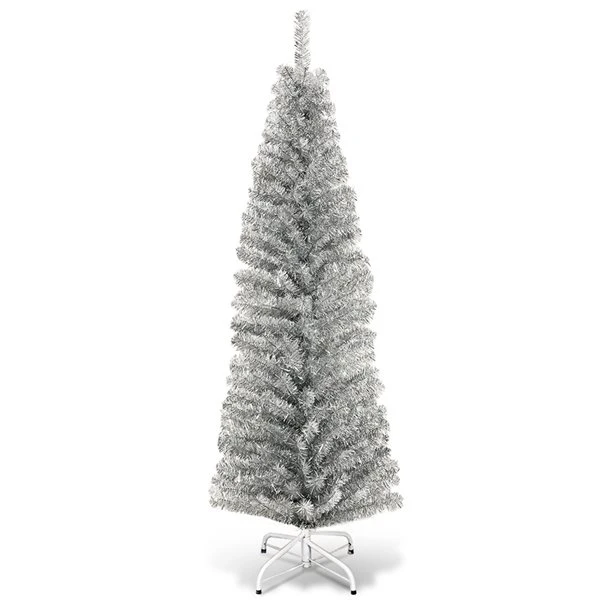Costway 6-ft Silver Tinsel Tree Unlit Slim Pencil Christmas Tree With Metal Stand Home Decor