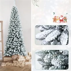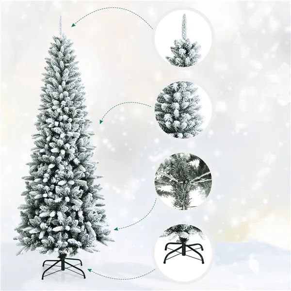 A snow-flocked artificial Christmas tree create strong festive atmosphere and wintry vibe in your home. Standing at 7.5 ft, this snow-flocked tree comes with 1189 branch tips, which have 2 leaf shapes to create natural gradations. Plentiful snow-flocked leaves create flourishing and luxuriant appearance. And this Christmas pencil tree adopts premium PVC and PE materials, making it stand out of inferior trees.