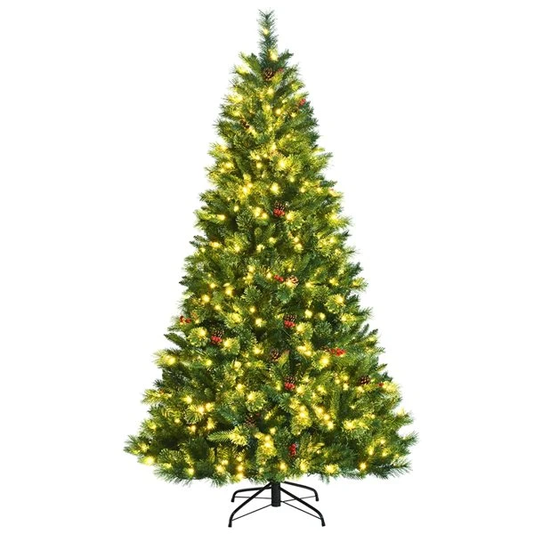 Costway 7-ft Pre-Lit Hinged Artificial Christmas Tree With Pine Cones And Red Berries