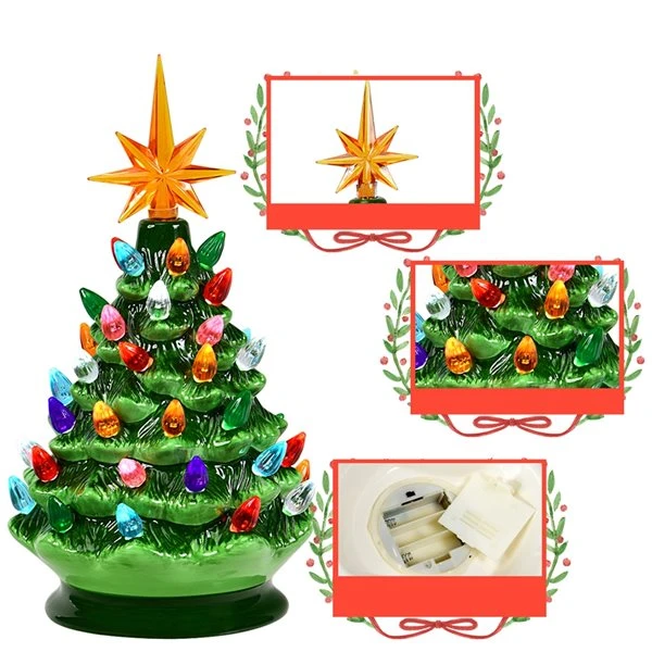 This is the brand new 9.5-in ceramic tabletop Christmas tree which combines stunning colour matching and exquisite hand-painted craftsmanship to bring the festival atmosphere and fun. Crafted of durable ceramic material, the pre-lit tree is fireproof and wear resistant, offering you long-term quality service. Equipped with lights and decorated with 44 colourful decorative beads and a 7-pointed star topper, there is no doubt that it will be the most eye-catching scene in the room. The ceramic decoration is battery powered (3 AA not included) so that it’s cordless to facilitate movement and storage. No installation required, just load the battery and turn on the switch to make the tabletop Christmas tree light up your room!