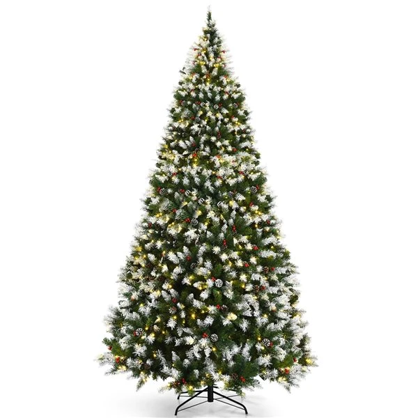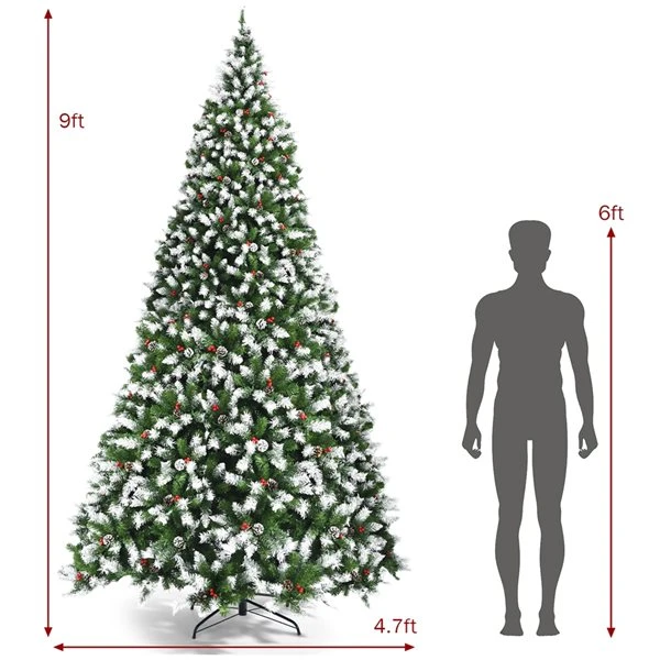 Have a wonderful Christmas have a great New Year! This snow flocked Christmas tree with 900 LED lights can be a nice answer for festival decoration. Standing at 9 feet tall, the artificial Christmas tree with pine cones and red berries is large and attractive. 2058 individually crafted branch tips sprayed white powder make the tree dense and lifelike. Such a realistic Christmas tree will bring a strong feeling of the festival to your home. Moreover, the tree equipped with 900 warm white LED lights also has excellent performance in the night.