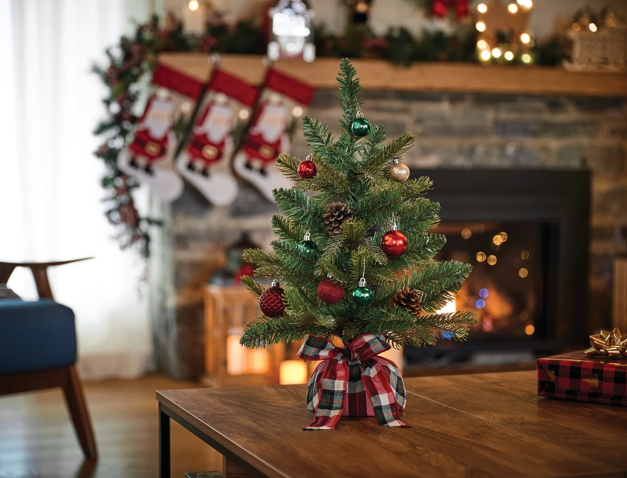 Great for small spaces, this easy all-in-one decoration kit features a small 26-inch artificial tree and decorations.