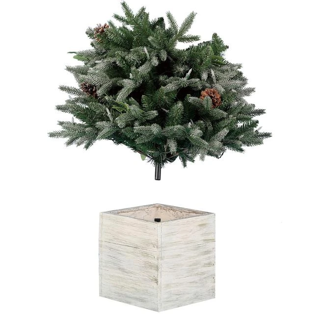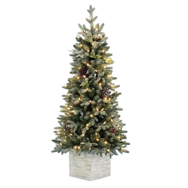 The Holiday Living Harpersville prelit tree features 100 warm white LED indoor lights. The tree is decorated with traditional pine cones and is fitted to a handcraft-looking cube pot.