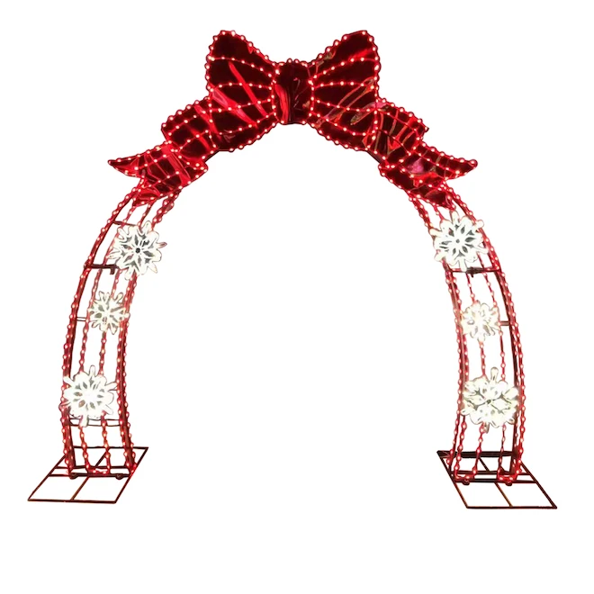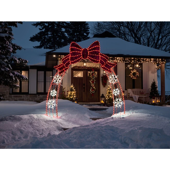 This adorned arch can be used on pathways and across doorways. Decorated with a bright red bow and shining snowflakes it is sure to make your holiday decorations complete. A mixture of warm white and red LED tape lights ensures full lighting coverage across frame and brilliant lighting all season long.