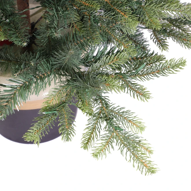 This 4-ft. (121.92 cm) nostalgic life-like tree is simple yet beautiful. It is pre-strung with 150 warm white LED lights. Accented in round brown and cream-colored potted base. It is perfect for that small space in your home or in an outdoor protected space.