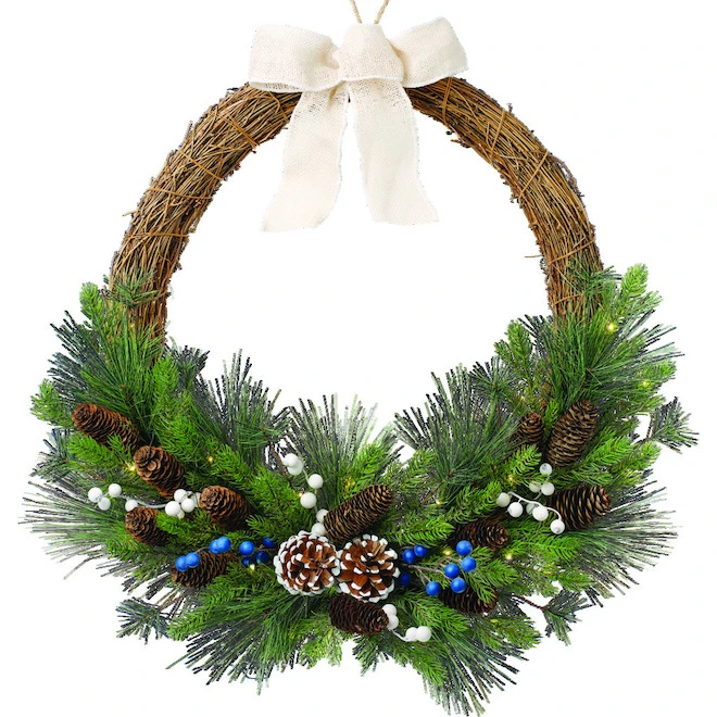 - 30-in pre-lit pinecone wreath with white and blue berries gives a festive look to your home’s holiday décor