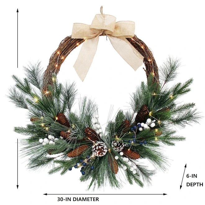 30-in pre-lit pinecone wreath with white and blue berries gives a festive look to your home’s holiday décor. Natural vine wreath base with realistic mixed greenery; 69 ct PE tips and 16 PVC tips, frosted and natural pinecones, berry stems and linen bow to complete the look. 25 warm white copper wire LED fairy lights illuminate the wreath with a constant glow. Wreath requires 3 AA batteries (not included). A convenient 6 hours on/18 hours off timer controls light operation.