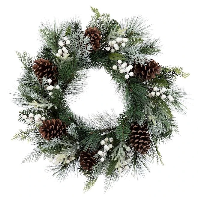 This festive 24 inch wreath trimmed with white berries and pine cones adds an elegant appearance to your Christmas decor. Easy to fluff and store. It will add warmth and texture to your holiday decor.