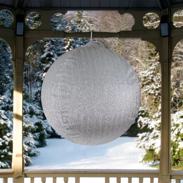 Take a load off this holiday season and let the decorations do the work. This silver inflatable ball ornament will make this year’s decoration a breeze. The shimmering effect is perfect for adding a bit of sparkle to your outdoor holiday decor. Add a string of lights to create a unique decoration. Product Features: Silver inflatable ball Christmas decoration. Vinyl ball covered in a stretchy tinsel covered fabric. Inflates and deflates for easy setup and storage. Comes ready to hang on a matching cord. Requires pump to inflate – not included. Perfect for indoor and outdoor use. Not a toy recommended for decorative purposes only. Note: Inflatable ball inside the decoration is heavy-duty vinyl like an exercise ball and requires a lot of air. We recommend that you use an air compressor or electrical pump to inflate to the maximum circumference.