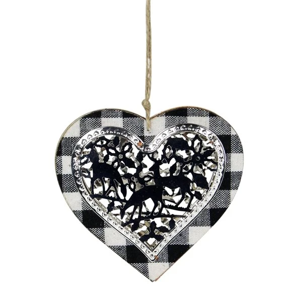 Northlight 4.25-in Black And White Buffalo Plaid Heart With Reindeer Christmas Ornament
