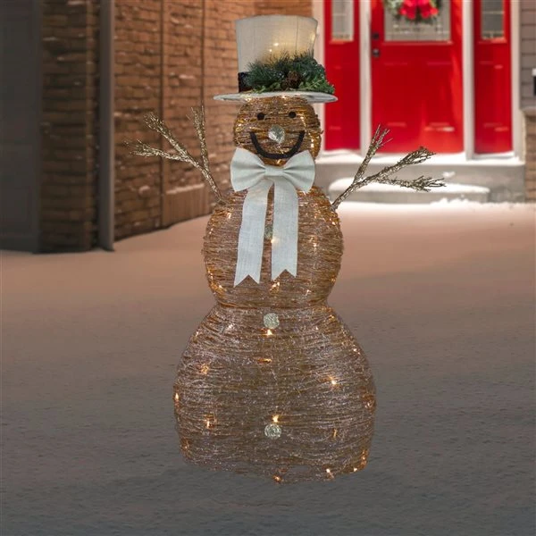 It’s the most wonderful time of the year! Bring a frosty friend to your holiday display with this rustic snowman. This rattan snowman is wearing a burlap top hat with pine sprigs and pine cones. He has a matching burlap bow and golden arms with a matching gold nose. This snowman is pre-lit by warm white LED lights and creates a unique glow to your decor. The smiling face of the snowman will create a warm and inviting touch to any area you display it for years to come.