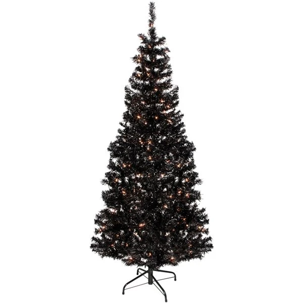 - Pre-lit black artificial Christmas tree