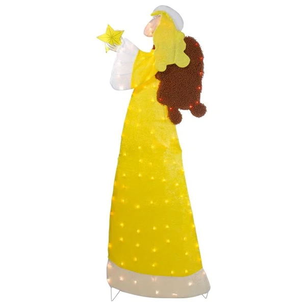 This yellow lighted angel is the perfect addition to your holiday display. She wears a yellow gown trimmed in white and holds a star. She is made of soft chenille fabric. Warm white lights add just the right amount of lighting. Ideal for yards porches or indoor spaces. Product Features: Pre-lit with 120 warm white lights. Bulb size: mini. Bulb type: incandescent. 59-in white lead cord. If one bulb burns out the rest will stay lit. Contains 1 plug with end connector which allows you to stack multiple lighted items together. Some easy assembly required. Ground stakes clips and cable ties included. Comes with replacement bulb and spare fuses. UL approved and certified for indoor or outdoor use.